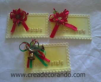 Confezione da 3 targhette assortite in pastigliaggio a tema natalizio con scritta "Buon Natale" e decorazioni in plastica. PRODOTTO NON COMMESTIBILE AD USO DECORATIVO.