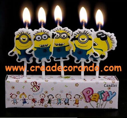 Confezione da 5 candele in cera su stecco a tema minions, fantasia come da foto