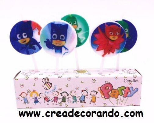 Confezione da 5 candele in cera su stecco a tema pj masks super pigiamini, fantasia come da foto